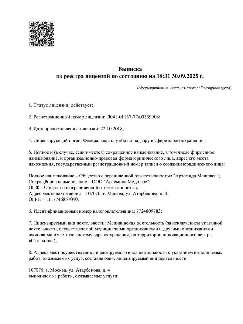 Диапазоны цен на приём врачей и специалистов, услуги и диагностику в Артемида Медплюс в Москве.