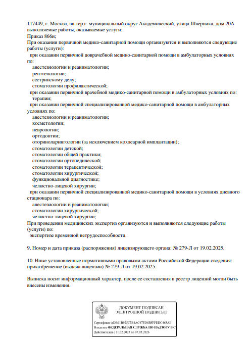 Предоставляет следующие услуги: восстановление зубной эмали и формы зубов, реставрацию зубов, молочных зубов, эстетическую реставрацию, специализируется на терапевтической стоматологии, лечении кист зубов и др.