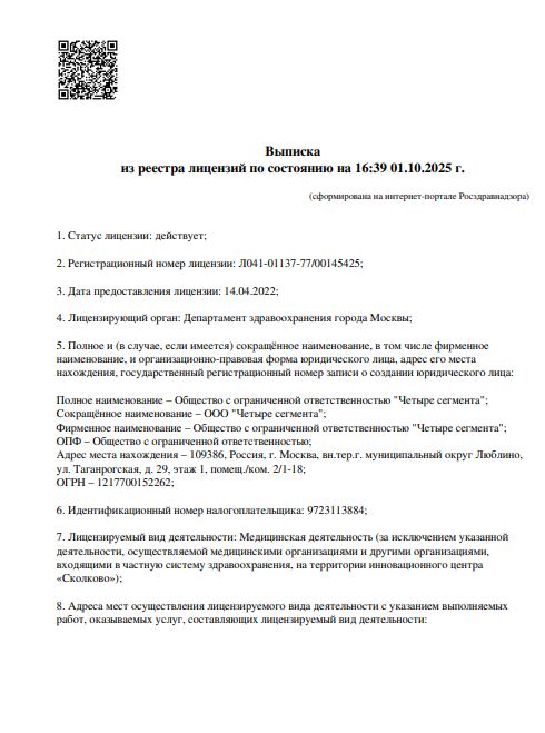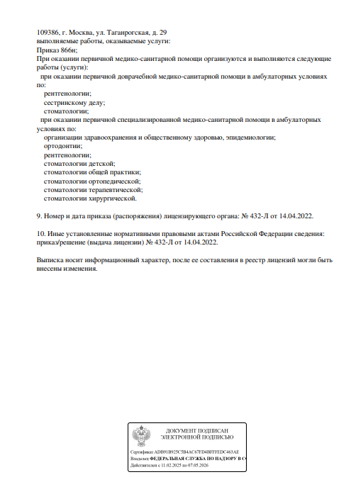 Проводит консультации, лечение кариеса, отбеливание зубов, профессиональную гигиену, лечение дёсен, реставрацию зубов, лечение каналов зубов, лечение под закисью азота, лечение под седацией, рентгенологию и КТ.