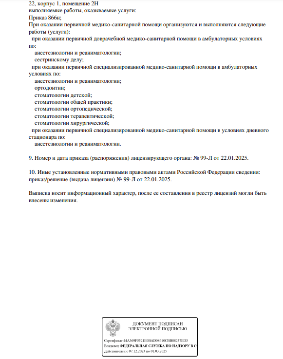 Специализируется на таких направлениях, как терапевтическая стоматология, эндодонтия, хирургия, имплантация, ортодонтия, ортопедия, отбеливание зубов.